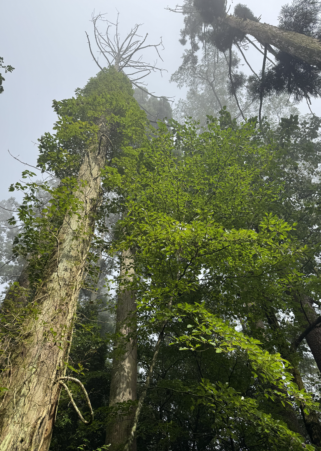 在天目山柳杉古树群中,树龄超千年的有580余株,最老的“大树王”虽已枯朽,树干上却附生着蕨类、苔藓,构成“树上森林”,焕发新的生机。