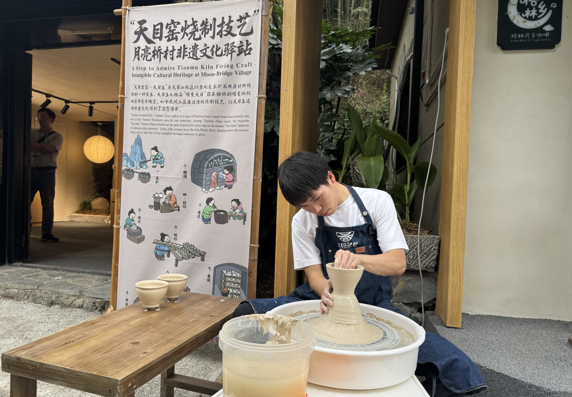 绿意不仅保护了古树与动物,也为山脚下的月亮桥村送来“金钥匙”。“新村民”方嘉伟正忙着帮助游客体验天目盏制作。砂土在他指尖旋转,初步成型后将放入窑炉中继续烧制。“天目盏还当过国礼!”他笑道。